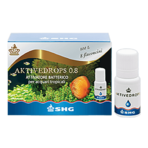 Aktivedrops 0.8 elimina la concentrazione di ammoniaca, nitriti, nitrati e riduce i fattori di stress nei pesci, i fenomeni putrefattivi ed i cattivi odori.