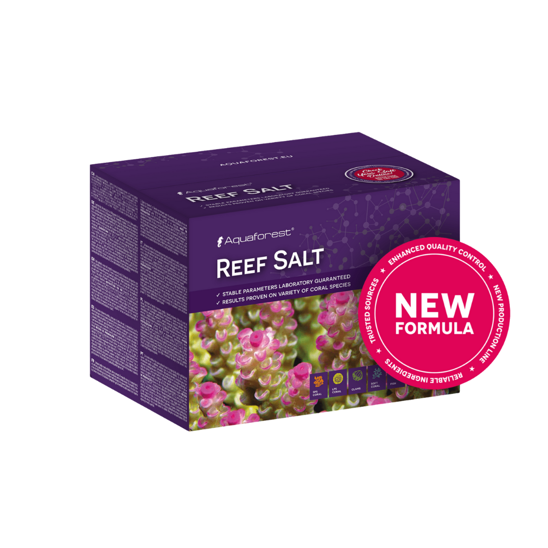 Sale marino completamente sintetico creato pensando all’allevamento dei coralli. La composizione del sale è stata selezionata per creare le migliori condizioni per gli animali marini. I micro e macro elementi contenuti in esso soddisfano a pieno le necessità, da parte dei coralli, di elementi necessari al loro adeguato sviluppo e alla loro colorazione. L’aggiunta, nella formula, di batteri probiotici influisce positivamente sulla riduzione dei nitrati e dei fosfati oltre a frenare lo sviluppo di microorganismi patogeni negli acquari marini. L’acqua di mare così preparata può essere immediatamente utilizzata per il cambio dopo la dissoluzione del sale. Nell’allestimento di nuovi acquari marini, i primi animali invitiamo a non immetterli prima di 10-14 giorni dal riempimento dell’acquario. Il sale contiene bromuri, come nella naturale acqua di mare, per questo motivo non è consigliato in sistemi di filtraggio che utilizzanoi ozono; per l’utilizzo dell’ozonizzatore consigliamo il sale Reef Salt Aquaforest. Per la presenza di batteri probiotici, consigliamo di mantenere il livello KH (durezza dell’acqua) nel range 6,5-8,0, un livello più elevato puo negativamente influire sulle condizioni dei coralli SPS.