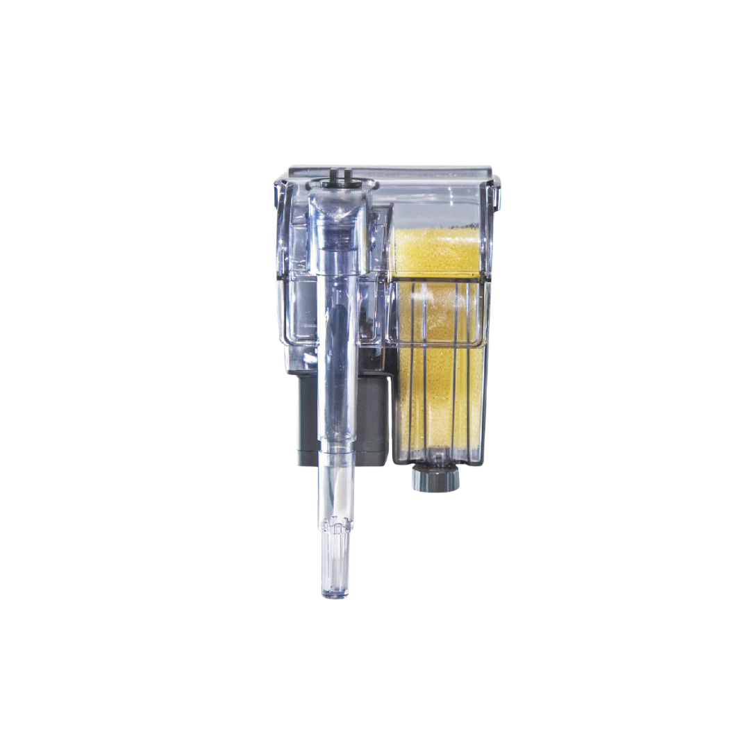 Nano filtro esterno appeso per acquari aperti fino a 15 litri; montaggio hang-on a bordo vasca con mandata a cascata.