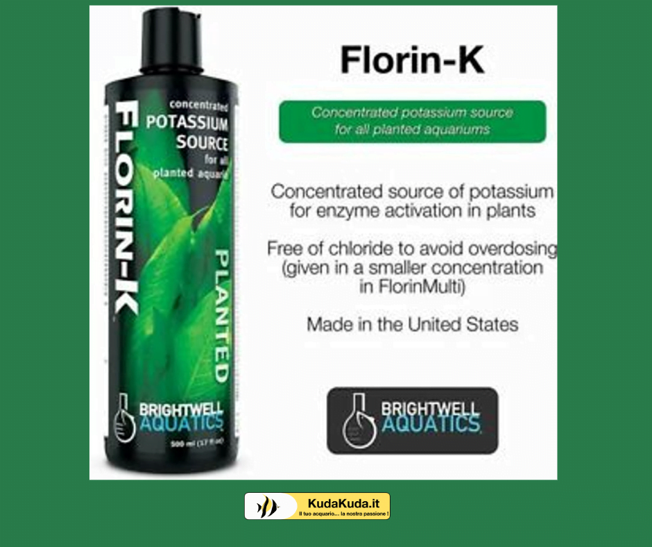 La velocità con cui il potassio viene consumato dipende dalla velocità di crescita delle piante, perciò acquari densamente popolati, con ottimi valori chimici ed ambientali, richiederanno un supplemento regolare di potasssio.. Brightwell Aquatics Florin-K è un additivo a base di potassio purissimo, non contiene cloruro (anche se il cloruro è un elemento vitale per le piante, è richiesto solo in piccolissime quantità, contenute in Brightwell Aquatics FlorinMulti). Poiché la richiesta di potassio da parte delle piante è più alta rispetto a quella di altri nutrienti, Florin-K è potente e concentrato (50,000 ppm), e questo lo rende una fonte efficace ed economica di potassio.