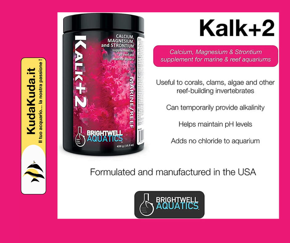 Calcio, magnesio e stronzio sono fondamentali per la formazione dell’aragonite. Questo minerale costituisce il materiale scheletrico degli invertebrati ermatipici come coralli, tridacne, alghe calcaree, vermi tubicoli ecc. Brightwell Aquatics Kalk+2 apporta questi elementi e può essere utilizzato per mantenere costante il ph negli acquari di barriera. Kalk+2 non contiene sali di cloruro, questa è una caratteristica che lo rende molto apprezzato dagli acquariofili esperti. L’uso di prodotti tipo kalkwasser è ancora molto popolare fra gli acquariofili, nonostante le molte innovazioni nel campo dell’integrazione del calcio.