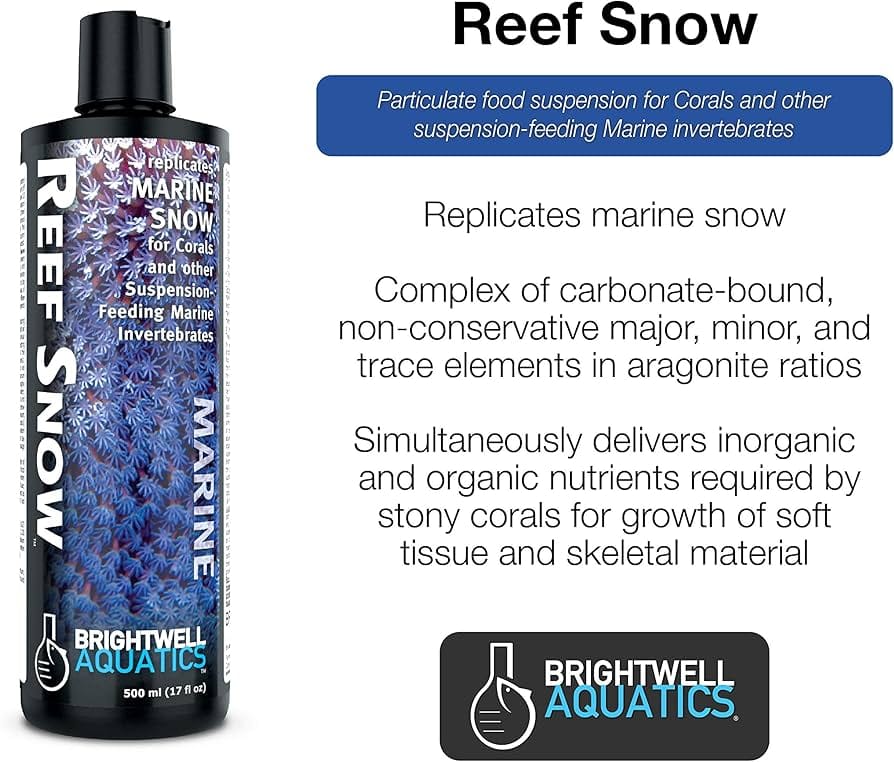 Brightwell Aquatics Reef Snow riproduce efficacemente il concetto di “marine snow” combinando un nucleo centarle di carbonati, elementi maggiori, minori ed in traccia (nelle stesse proporzioni rilevate nell’aragonite) con proteine ed acidi grassi di origine marina (nelle proporzioni riscontrate nei tessuti corallini).