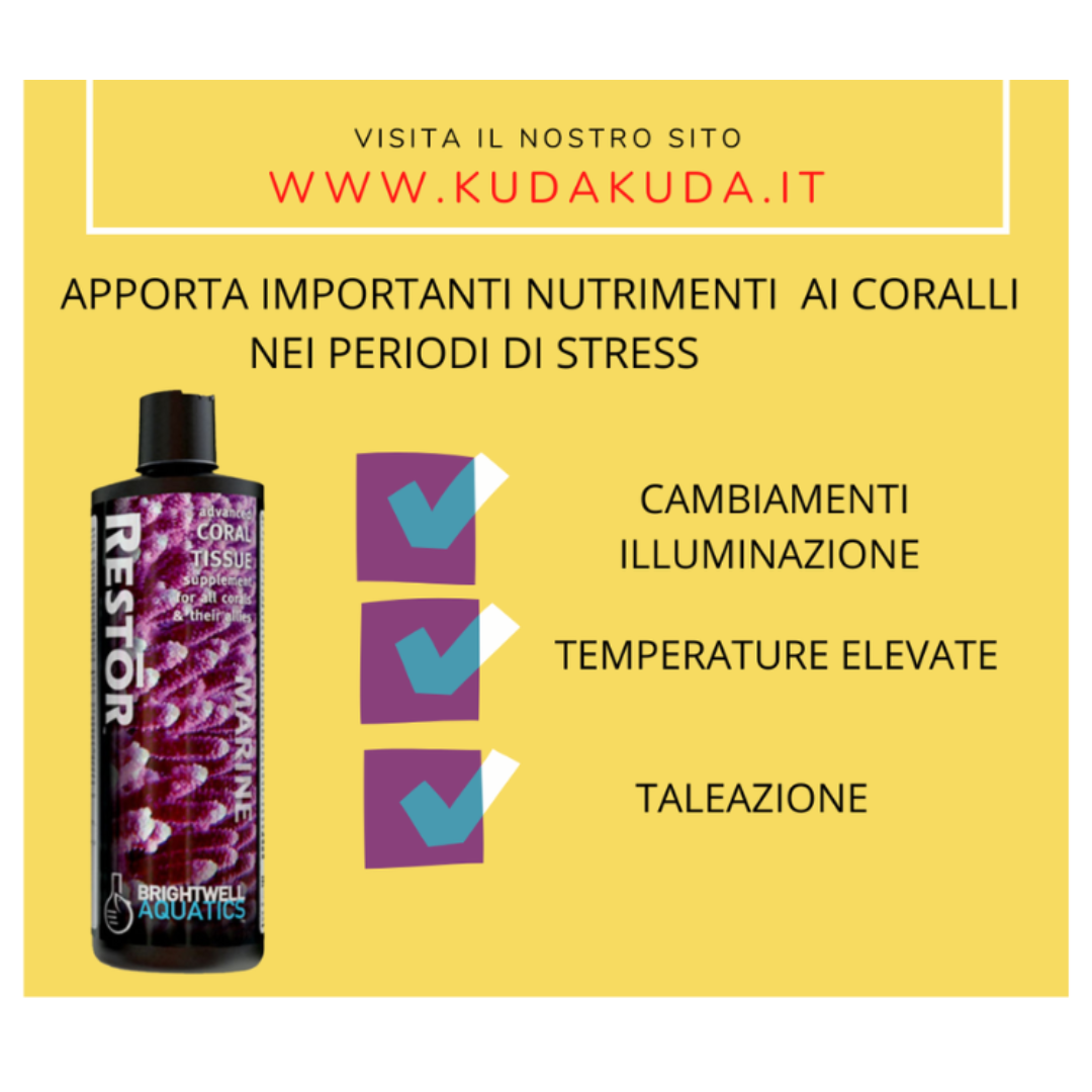 Brightwell Aquatics Restōr è un complesso di amino acidi ed acidi grassi derivati da pesci marini e crostacei. E’ una fonte potente di EPA, DHA ed altri acidi grassi omega-3, così come di pigmenti naturali. Restōr è stato specificamente formulato per la cura dei coralli che sono da poco in un nuovo acquario e devono adattarsi ad una nuova illuminazione, sono stati recentemente esposti, in modo prolungato, a temperature elevate (questo induce l’espulsione delle zooxantelle simbionti, fenomeno conosciuto come sbiancamento o “bleaching”), o hanno subito danni tissutali durante la frammentazione o la propagazione oppure per l’attività indesiderata di qualche abitante dell’acquario.
