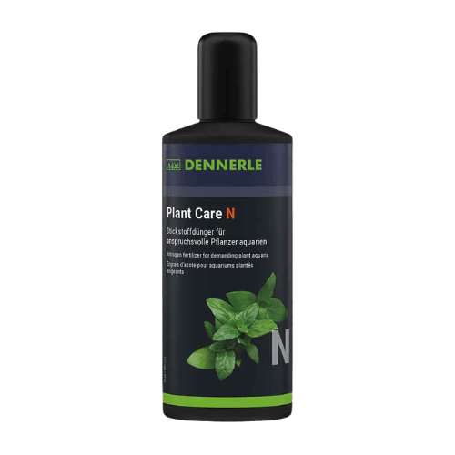 Nel caso di acquari piantumati esigenti è quindi molto utile tenere d’occhio il contenuto di nitrati e integrarlo se necessario. Ogni acquario ha un consumo specifico di nutrienti che dipende dalla quantità di piante, specie vegetali, ceppo animale, alimentazione, cambi d’acqua e condizioni di crescita (quantità di luce, tempo di illuminazione, aggiunta di CO 2 , tecnologia di filtraggio, ecc.). La quantità necessaria di fertilizzante dovrebbe quindi essere determinata individualmente per ogni acquario. Se l’acquario necessita di tutti e 3 i macronutrienti N, P e K, si consiglia l’uso di Dennerle Plant Care NPK. I rapporti dei nutrienti sono stati scelti in modo tale che tutti i macronutrienti vengano assorbiti dalle piante nello stesso rapporto. Anche con un uso regolare a lungo termine, non possono esserci deficit o accumuli svantaggiosi di singoli nutrienti. Soprattutto con i macronutrienti, l’equilibrio biologico è di particolare importanza, cioè i nutrienti dovrebbero essere sempre presenti in una certa proporzione tra loro. È importante evitare squilibri nutrizionali poiché di solito portano a problemi di alghe. In circostanze particolari, l’acquario può avere un fabbisogno di azoto superiore alla media. C’è anche acqua di rubinetto che contiene abbastanza fosfato e potassio ma troppo poco azoto. In questi casi, Dennerle Plant Care Nessere utilizzato per fornire alle piante azoto in modo mirato. Raccomandiamo di misurare il livello di nitrati settimanalmente e di dosare Plant Care N di conseguenza. Il nitrato può essere misurato in modo accurato e affidabile con i test acquaristici. Anche i semplici test di immersione offrono una precisione sufficiente, ad esempio il Dennerle WaterTest 6in1. Se hai misurato e fertilizzato regolarmente per diverse settimane, puoi vedere a quale livello i valori misurati si stabilizzano e quali quantità di nitrati ha bisogno l’acquario. Quindi puoi aggiungere la dose settimanale determinata di Plant Care N come standard ed estendere gli intervalli di misurazione da 2 a 4 settimane con la coscienza pulita. Un fertilizzante a base di macronutrienti deve essere sempre utilizzato in combinazione con un fertilizzante a base di micronutrienti (fertilizzante completo di ferro). Per un apporto completo di sostanze nutritive e la migliore crescita possibile delle piante, consigliamo la combinazione con Plant Care Pro . Per una crescita rigogliosa delle piante e pesci e gamberi sani, consigliamo un cambio parziale dell’acqua dal 25% al 50% a settimana. Questo rimuove i rifiuti e gli inibitori e previene gli squilibri nutrizionali.