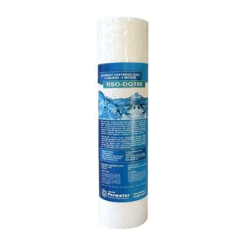 Cartuccia sedimenti professionale a densità gradiente con filtrazione selettiva centrale a 5 micron e prefiltrazione esterna a 10 micron.