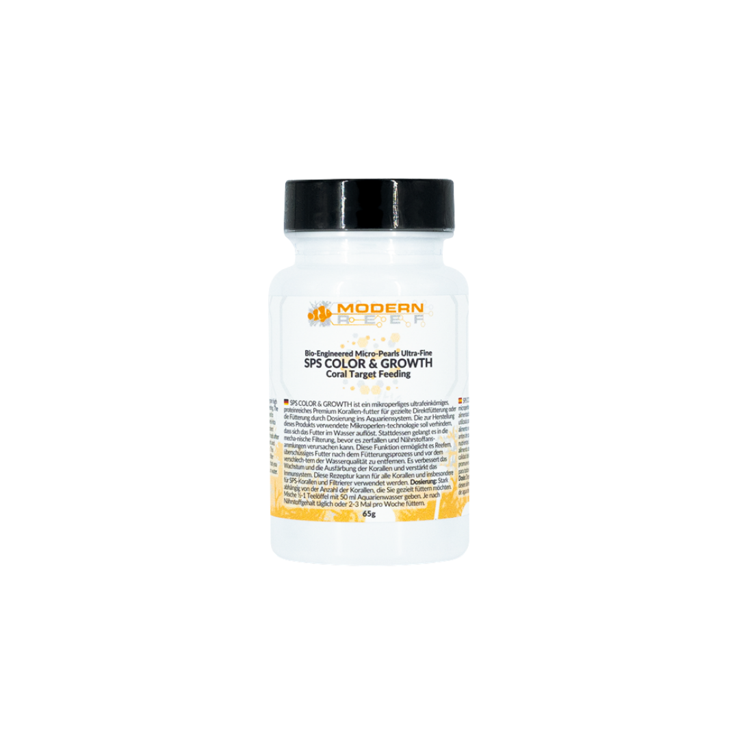 SPS COLOR & GROWTH è un mangime per coralli premium ad alto contenuto proteico a grana ultra fine microperla per l’alimentazione diretta o indiretta. La tecnologia della microperla utilizzata per creare questo prodotto è studiata per evitare che il cibo si diluisca nell’acqua. Al contrario, questo prodotto arriva nella filtrazione meccanica prima che possa rompersi e causare l’accumulo di nutrienti. Questa caratteristica consente di rimuovere il cibo in eccesso dopo il processo di alimentazione, prima che la qualità dell’acqua diminuisca. Migliora la crescita e la colorazione dei coralli e promuove un sistema immunitario più forte. Questa formula può essere utilizzata per tutti i coralli e in particolare per i coralli SPS e filtri alimentatori.