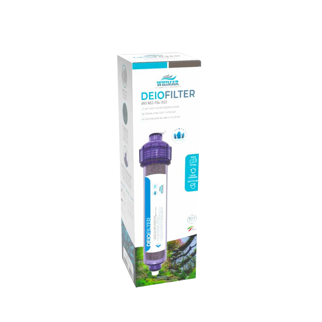Whimar Deio Filter è un kit post-filtro composto da una cartuccia trasparente al cui interno è inserita una resina deionizzante anti nitrati, fosfati e silicati; la resina vira dal verde al blu man mano che esaurisce il suo effetto deionizzante. La cartuccia trasparente consente di tenere costantemente sotto controllo lo stato di saturazione della resina.