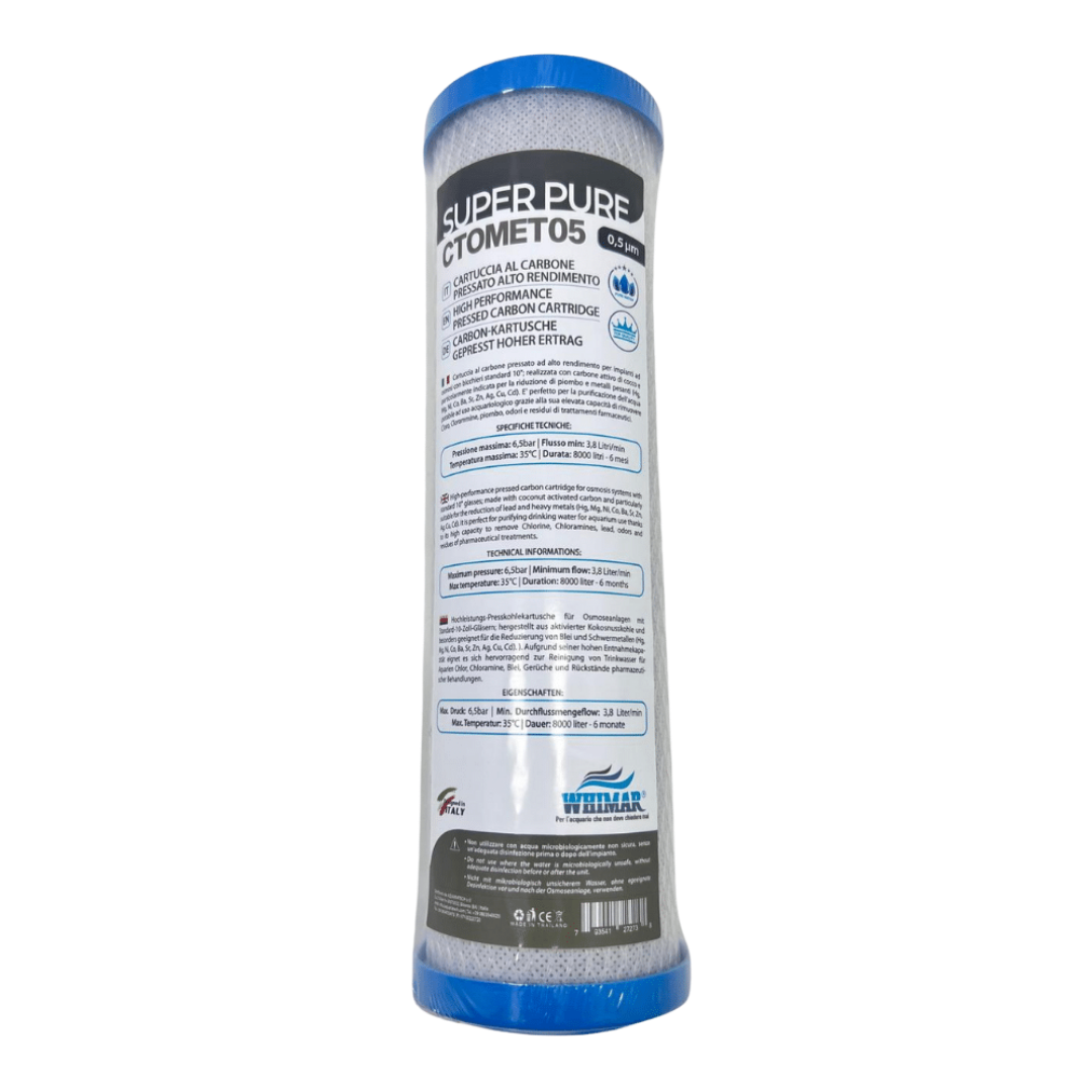 Cartuccia al carbone attivo pressato ad alto rendimento per impianti ad osmosi con bicchieri standard da 10″; realizzata con carbone super attivo granulare prodotto con qualità selezionate di gusci di cocco ad elevata densità, un ampio volume di micropori ed un elevata area di superficie equivalente.